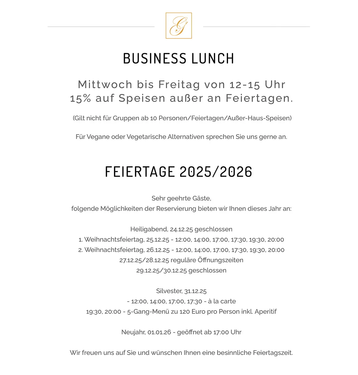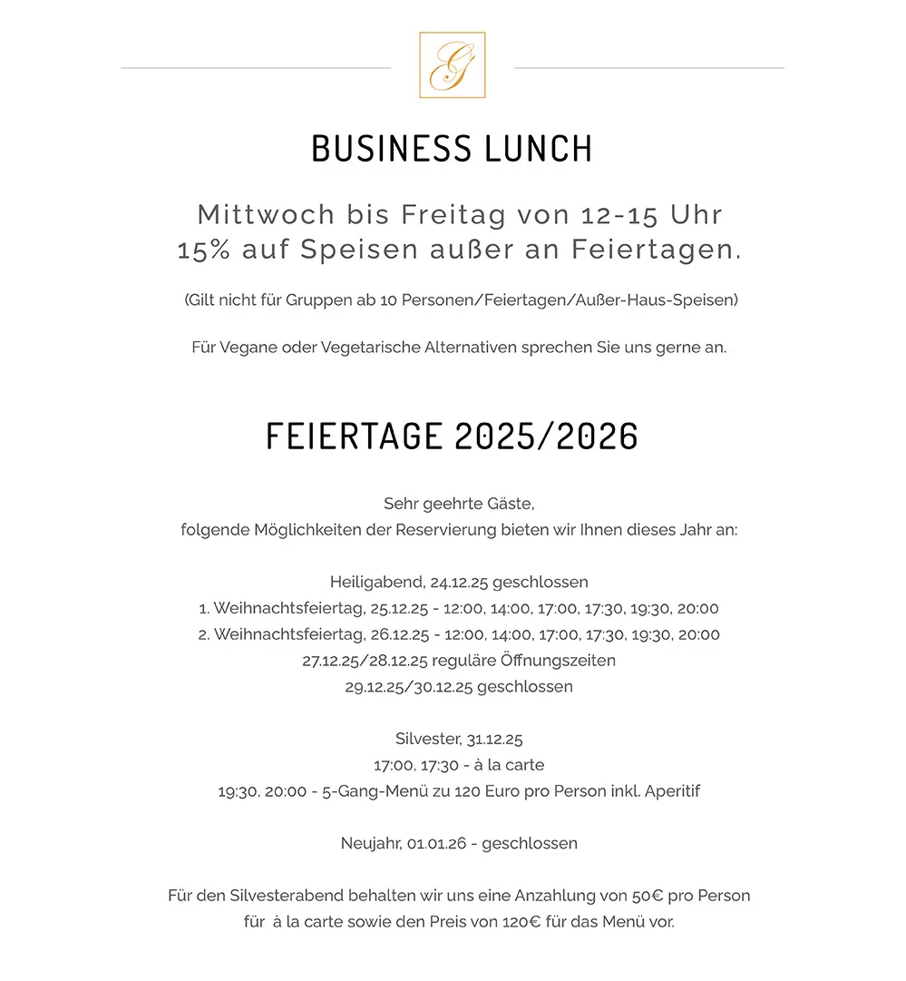 Wir verwöhnen Sie von Mittwoch bis Sonntags ab 12 Uhr mit moderner, innovativer mediterranen Küche. Dazu präsentieren wir Ihnen ausgesuchte europäische Weine. Genießen Sie das Ambiente dieses über 100 Jahre alten Fachwerkhauses im Restaurant, am Kamin oder bei schönem Wetter in unserem Garten. Ihre Feierlichkeiten richten wir in unseren größzügigen Gesellschaftsräumen aus, ganz nach Ihren Wünschen.