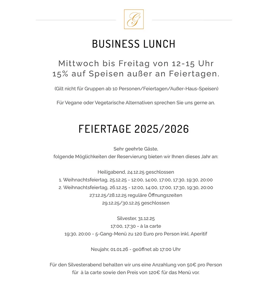 Wir verwöhnen Sie von Mittwoch bis Sonntags ab 12 Uhr mit moderner, innovativer mediterranen Küche. Dazu präsentieren wir Ihnen ausgesuchte europäische Weine. Genießen Sie das Ambiente dieses über 100 Jahre alten Fachwerkhauses im Restaurant, am Kamin oder bei schönem Wetter in unserem Garten. Ihre Feierlichkeiten richten wir in unseren größzügigen Gesellschaftsräumen aus, ganz nach Ihren Wünschen.